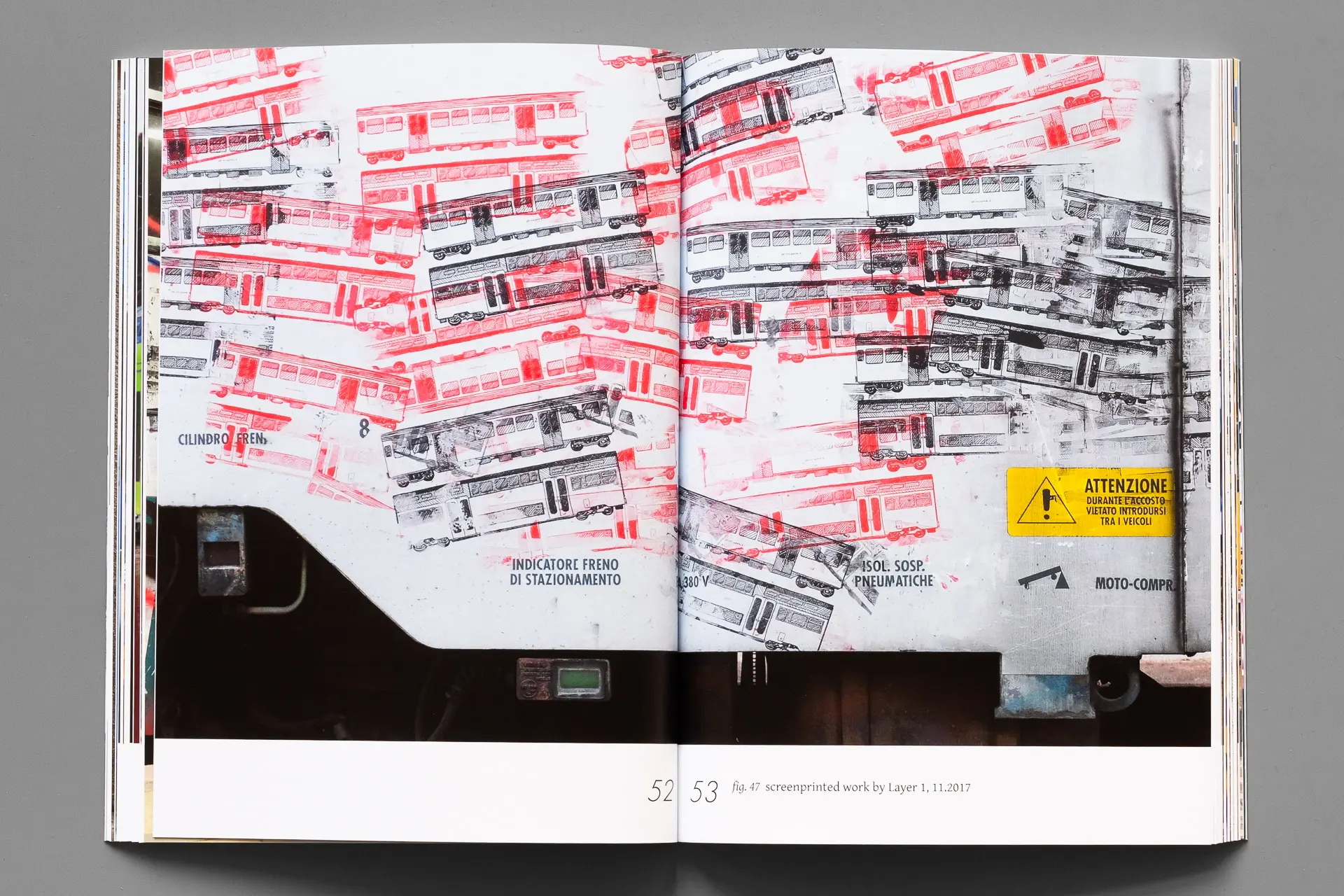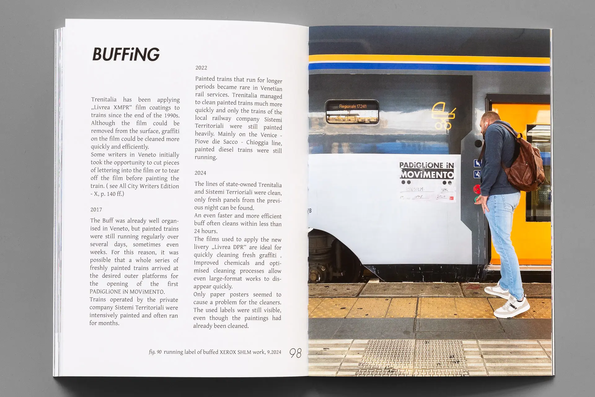 The three large main chapters present the works, several detailed analysis and background information on the actions happening in the years 2017 (‘ViVA TRENO ViVA’), 2022 (‘PADiGLiONE VANDALEi’) and 2024 (‘THE GOLDEN BENCH’). Right from the beginning each work was accompanied by a label just like official Biennale artworks, although executed on regional trains or near the railway tracks.